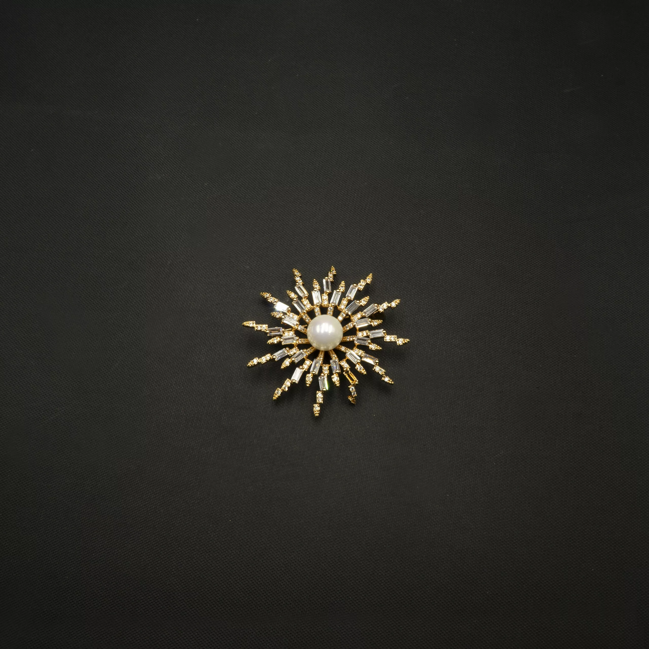 BR-004 – Golden Sunburst Gilded Flower Brooch with American Diamonds