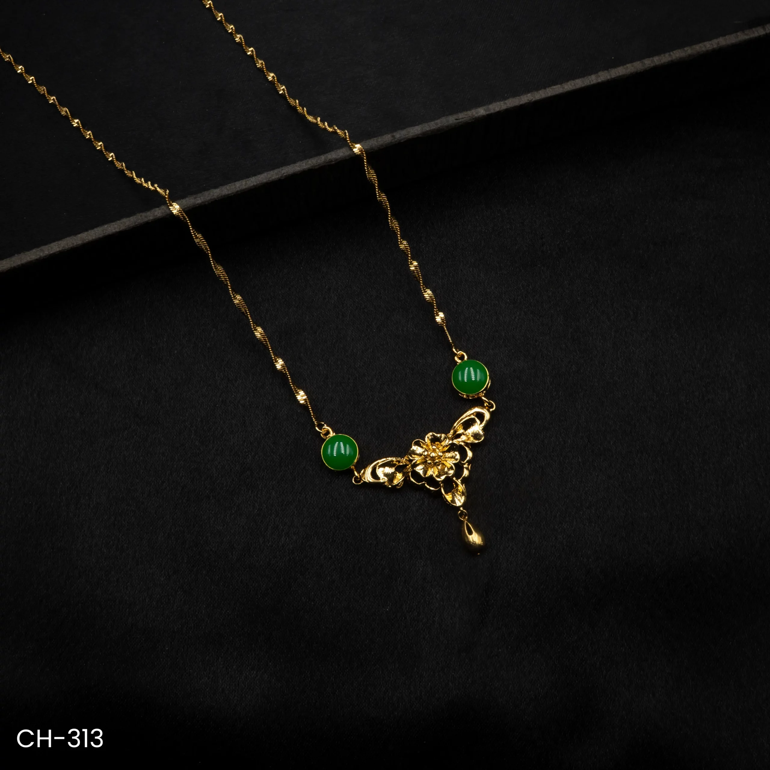 CH-312 - Elegant & Affordable Green Accent Petal Curve Necklace with Mini Flower Drop
