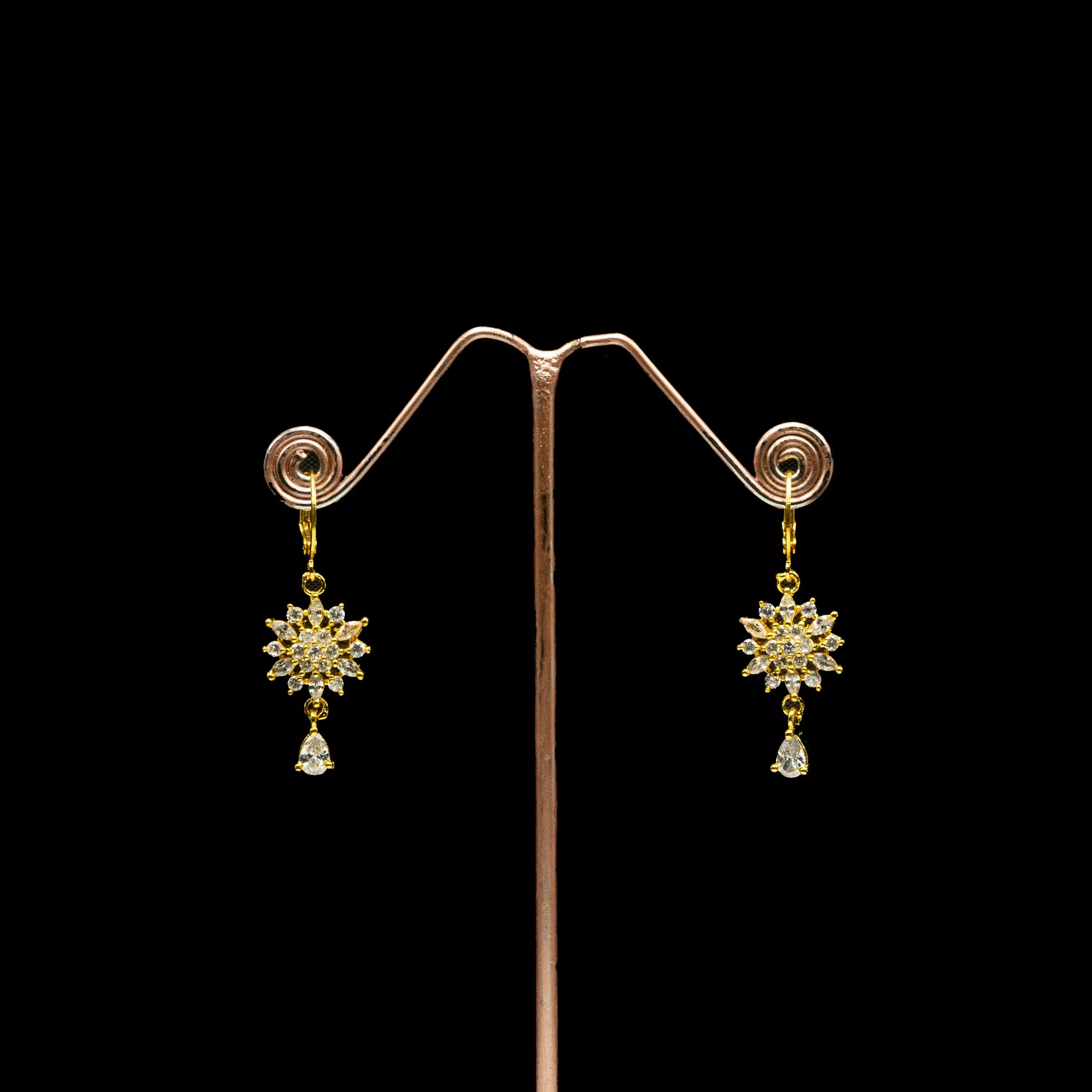 Tags: American Diamond, Brass, Cubic Zirconia, Dangle, Earrings, Flower, Gold Plated, White