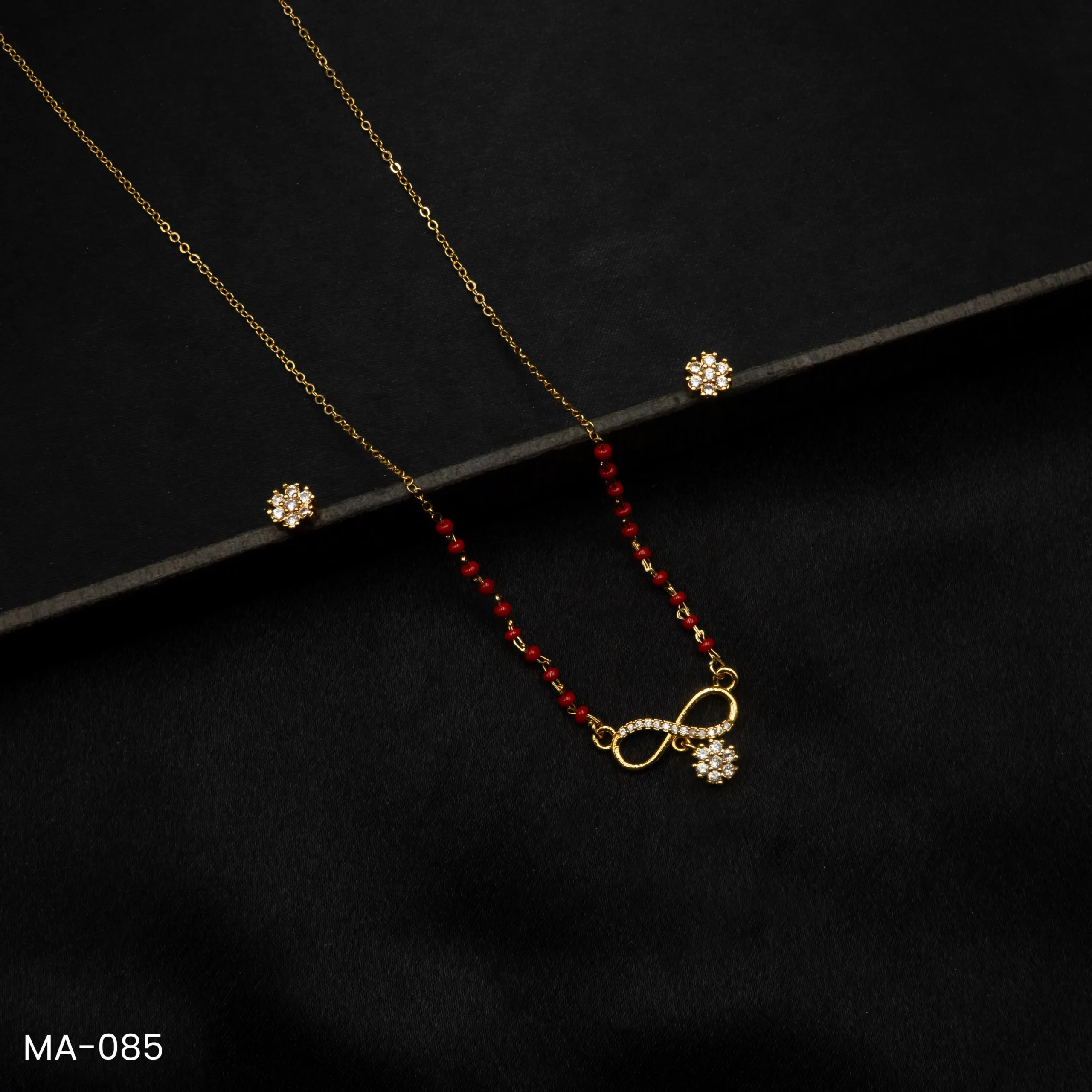 MA-085 – Stylish Infinity Red Beads Mangalsutra & Earrings with American Diamond Flower Charm