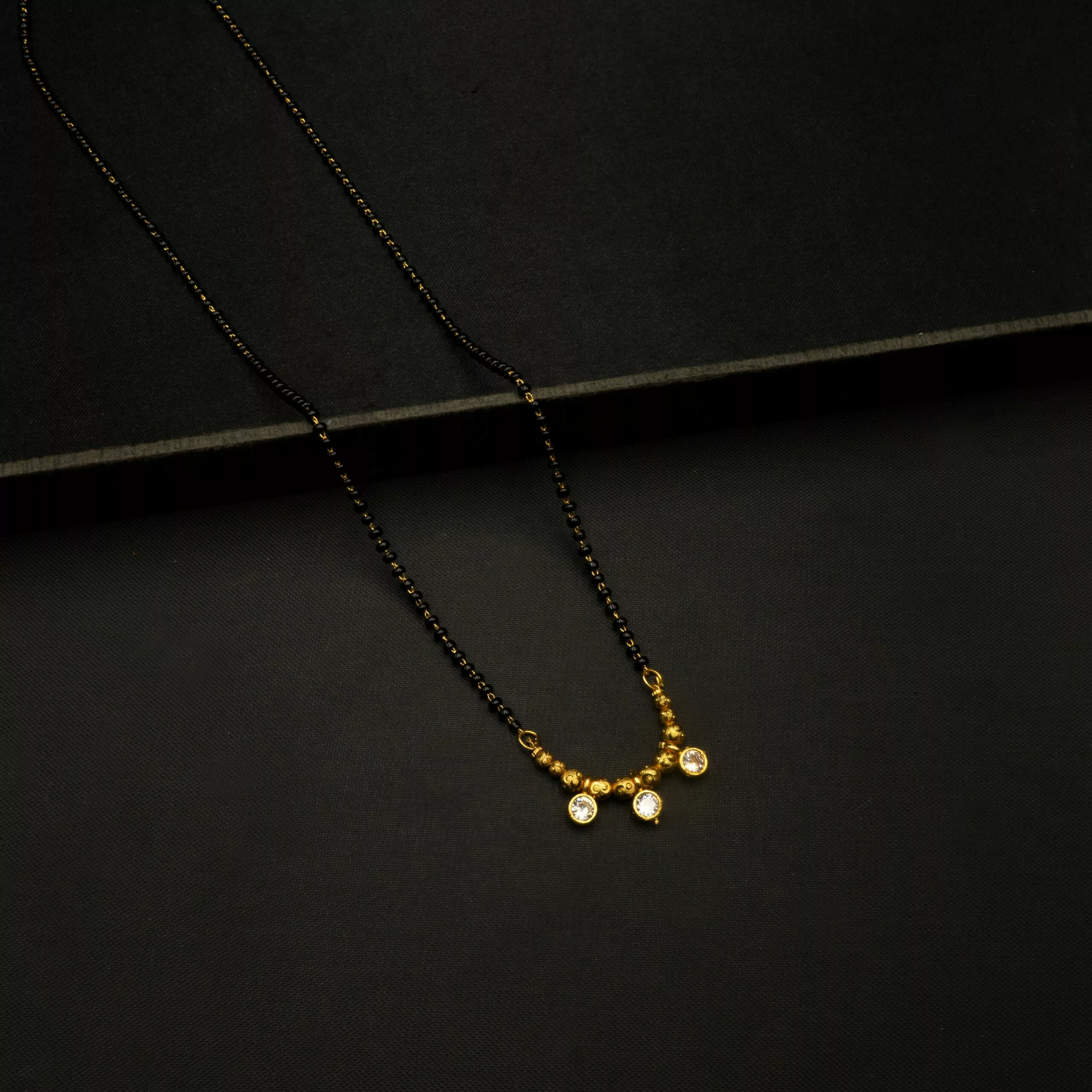 Tags: American Diamond, Black Beads, Brass, Cubic Zirconia, Gold Plated, Golden, Mangalsutra, Minimal