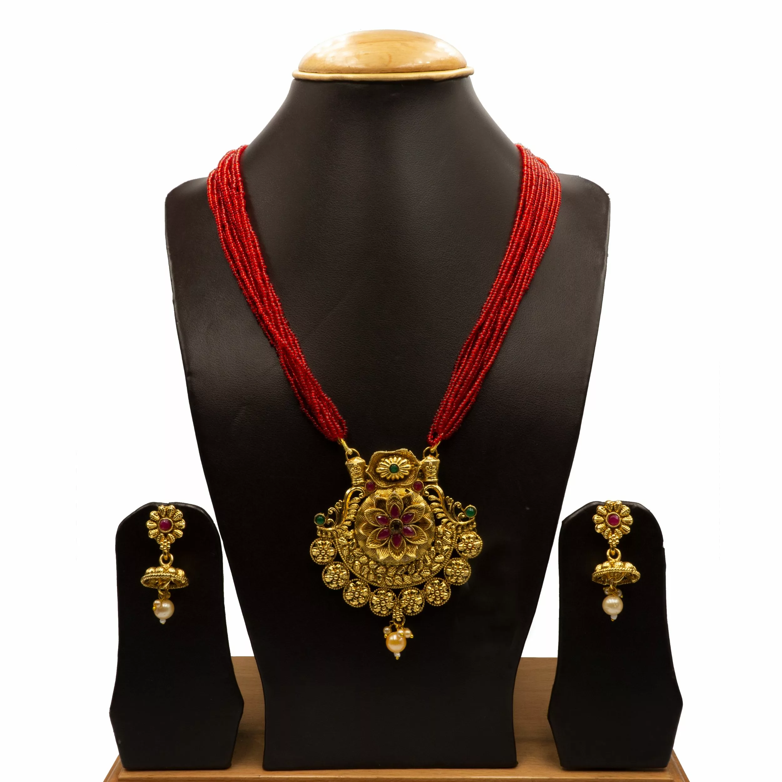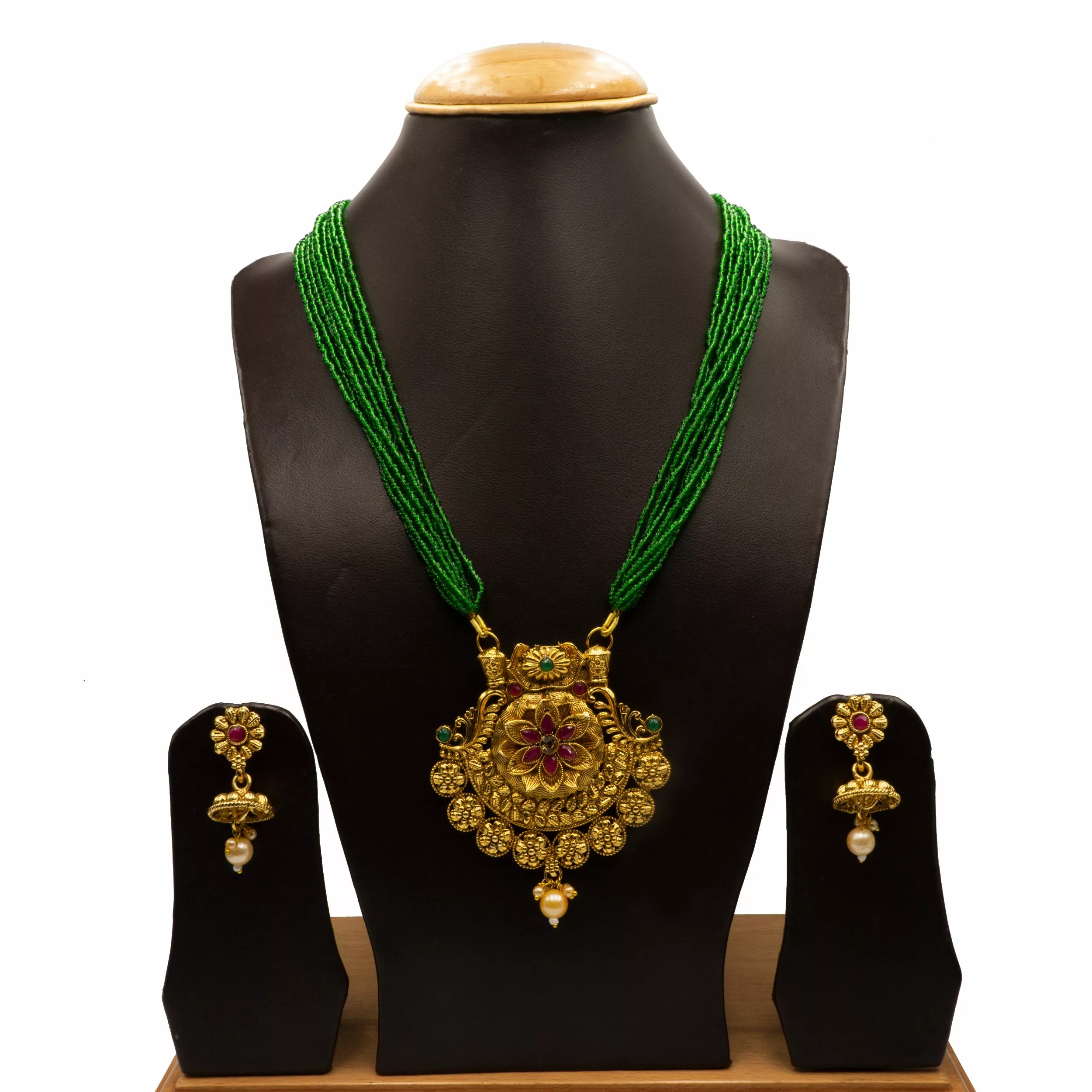 Tags: Brass, Earrings, Emerald, Gold Plated, Golden, Green, Necklace, Necklace Set, Pote, Red, Ruby, Traditional