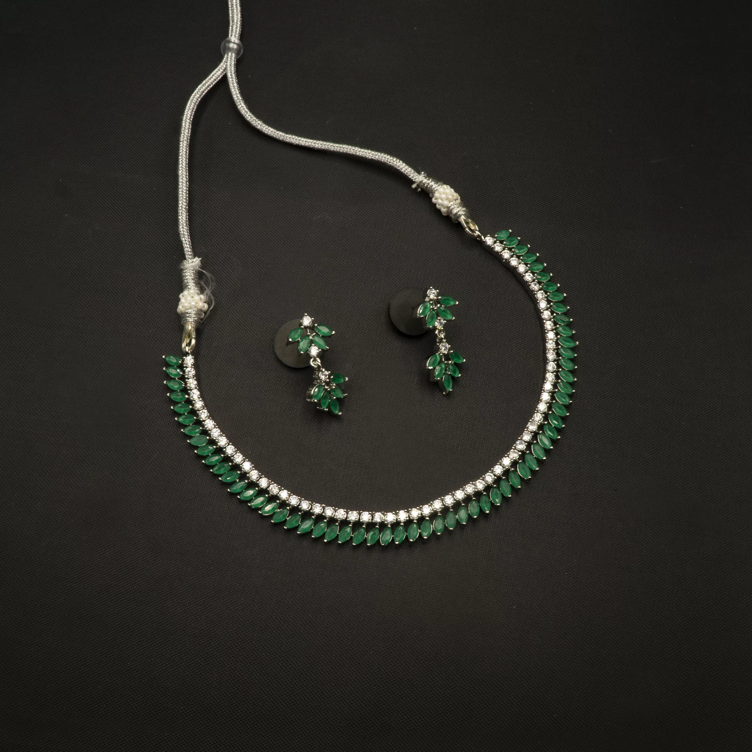 Tags: American Diamond, Brass, Collar Necklace, Cubic Zirconia, Emerald, Green, Necklace, Necklace Set, White, White Gold, White Gold Plated