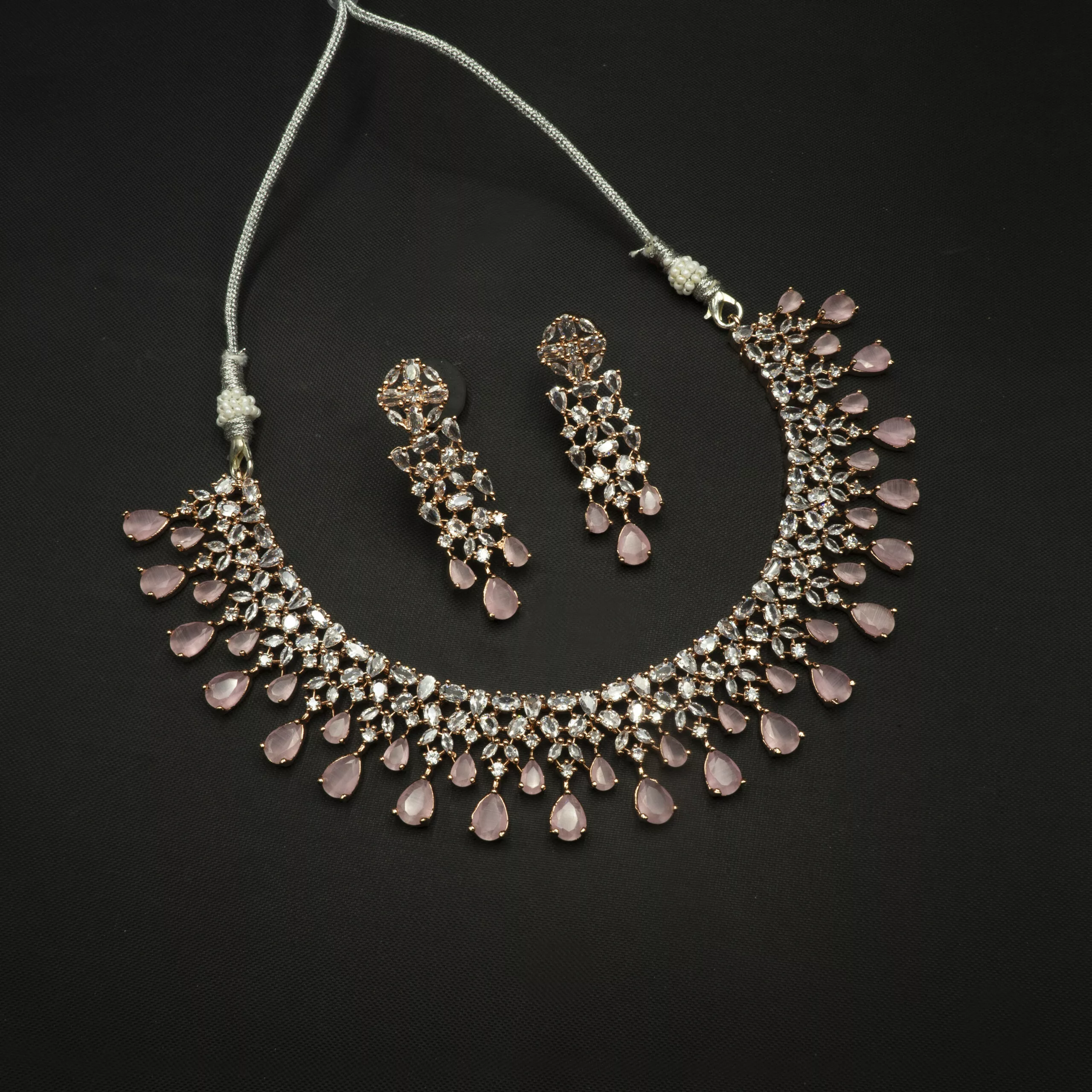 Tags: American Diamond, Brass, Collar Necklace, Cubic Zirconia, Necklace, Necklace Set, Pink, Pink Stones, Rose Gold, Rose Gold Plated