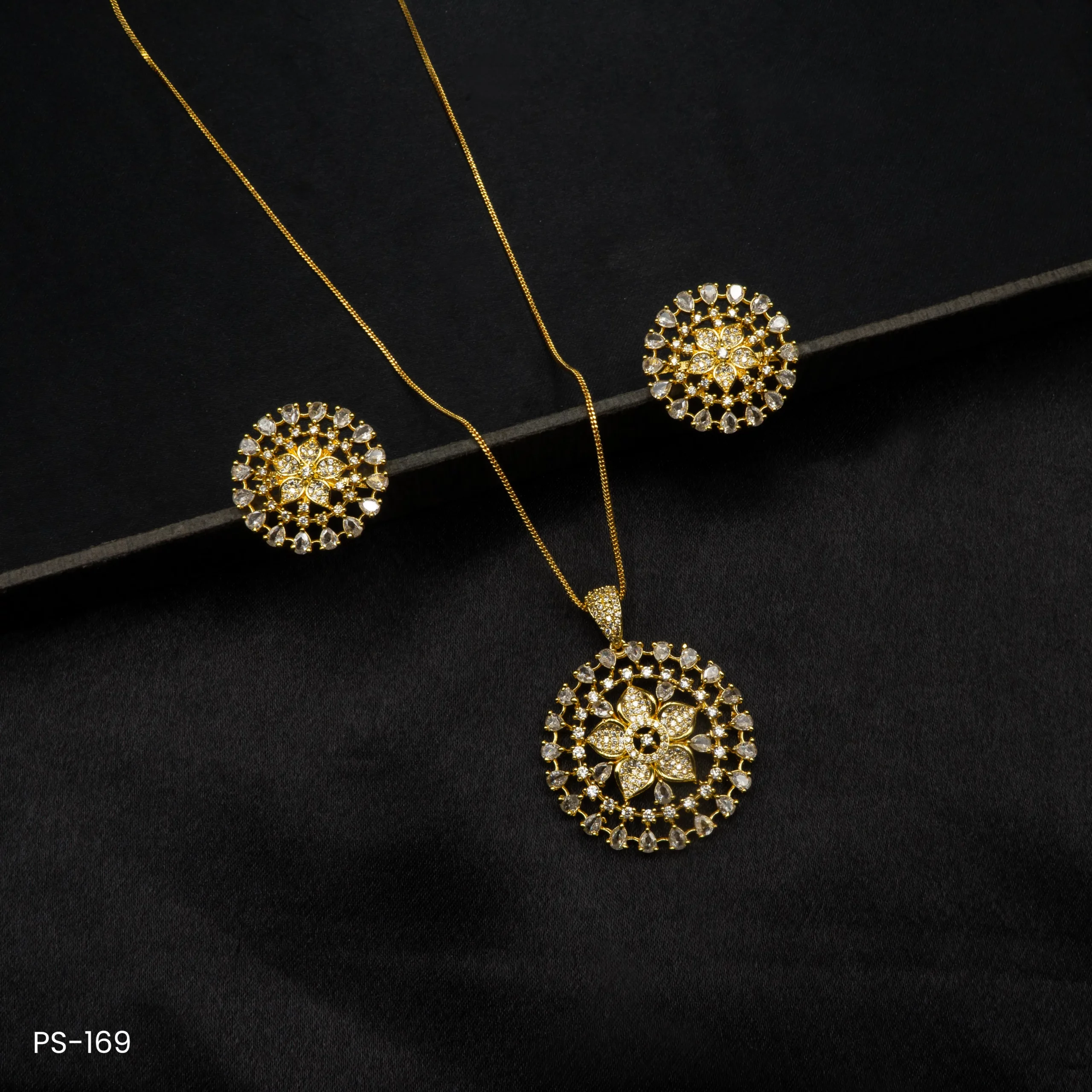 PS-169 – Gold Plated American Diamond Floral Pendant Necklace with Matching Earrings
