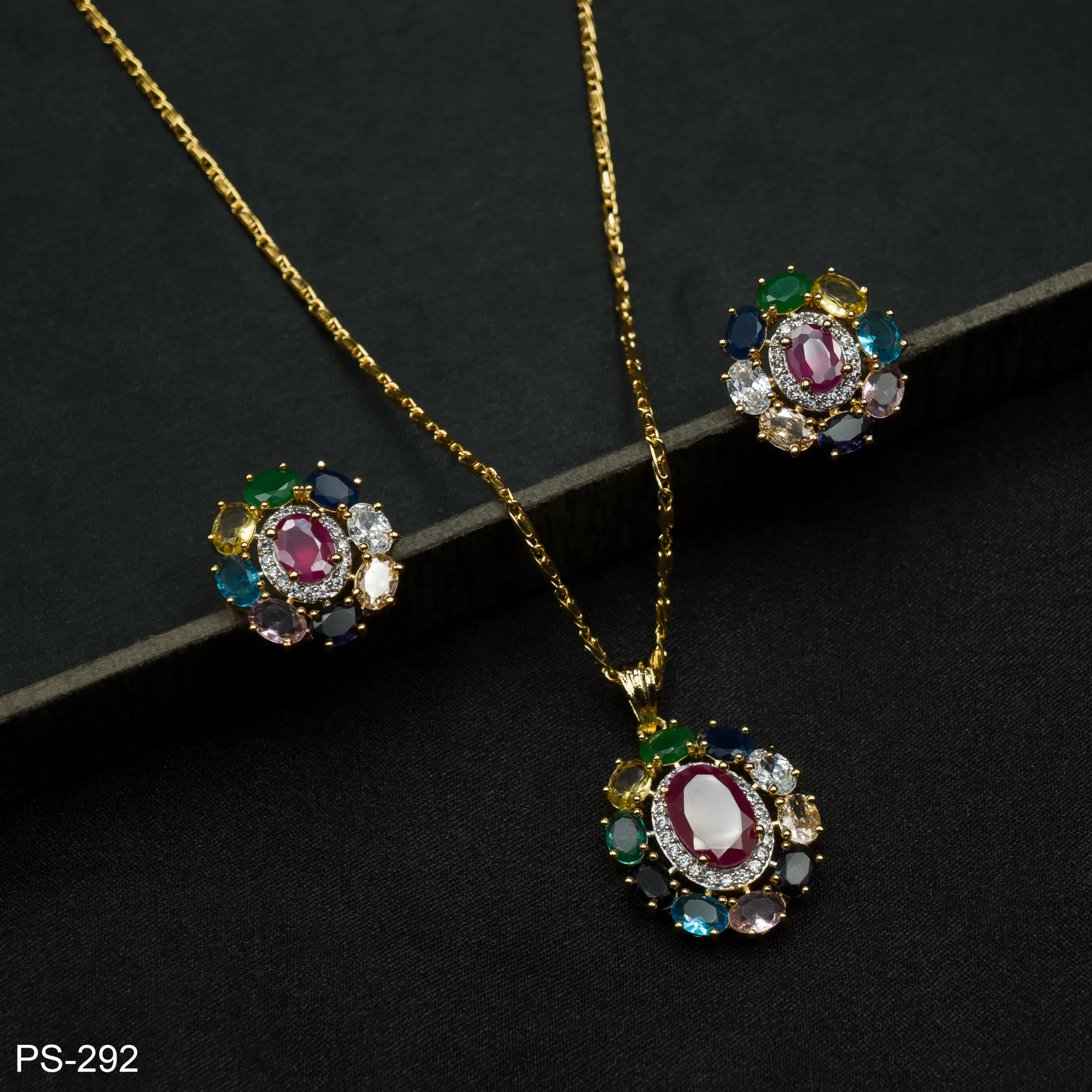 PS-292 – Vibrant Festive Wear Oval Ruby & Multicolor Stone Navratna Pendant Set