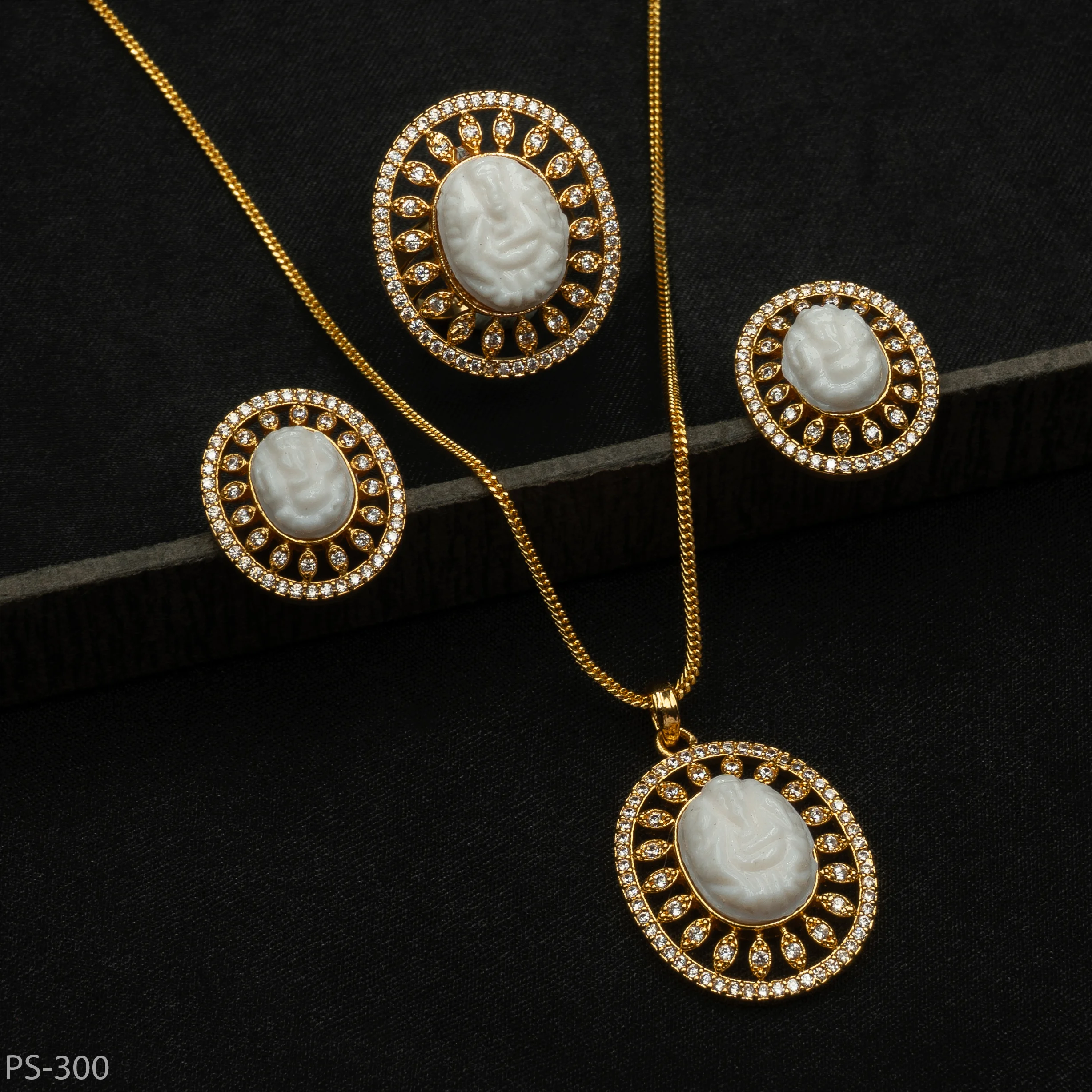 PS-300 – Divine Serenity Traditional White Muga Ganesh Pendant Set With American Diamonds