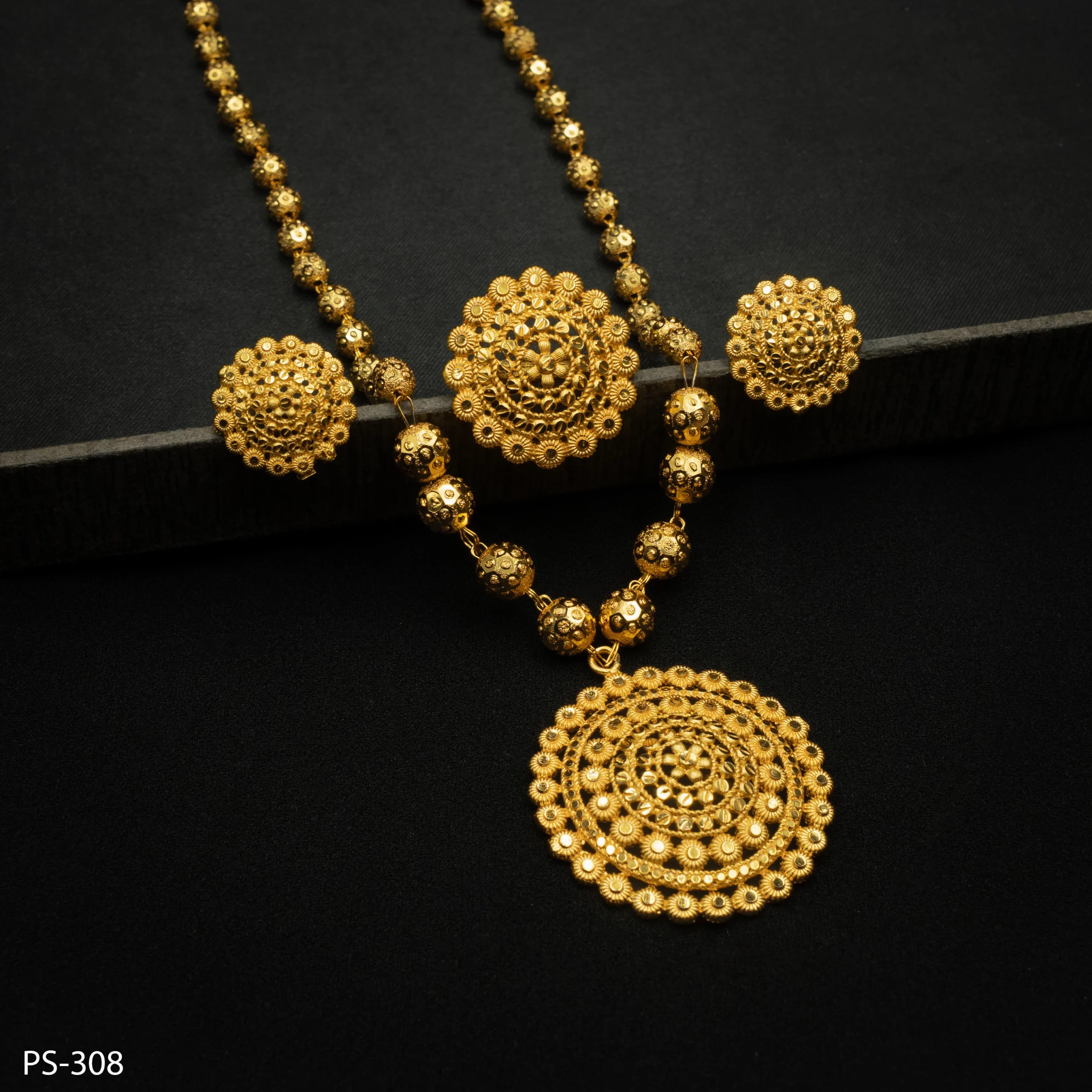 PS-308 – Intricate Gold Plated Complete Traditional Set for Weddings and Festivals with Necklace, Earrings & Ring